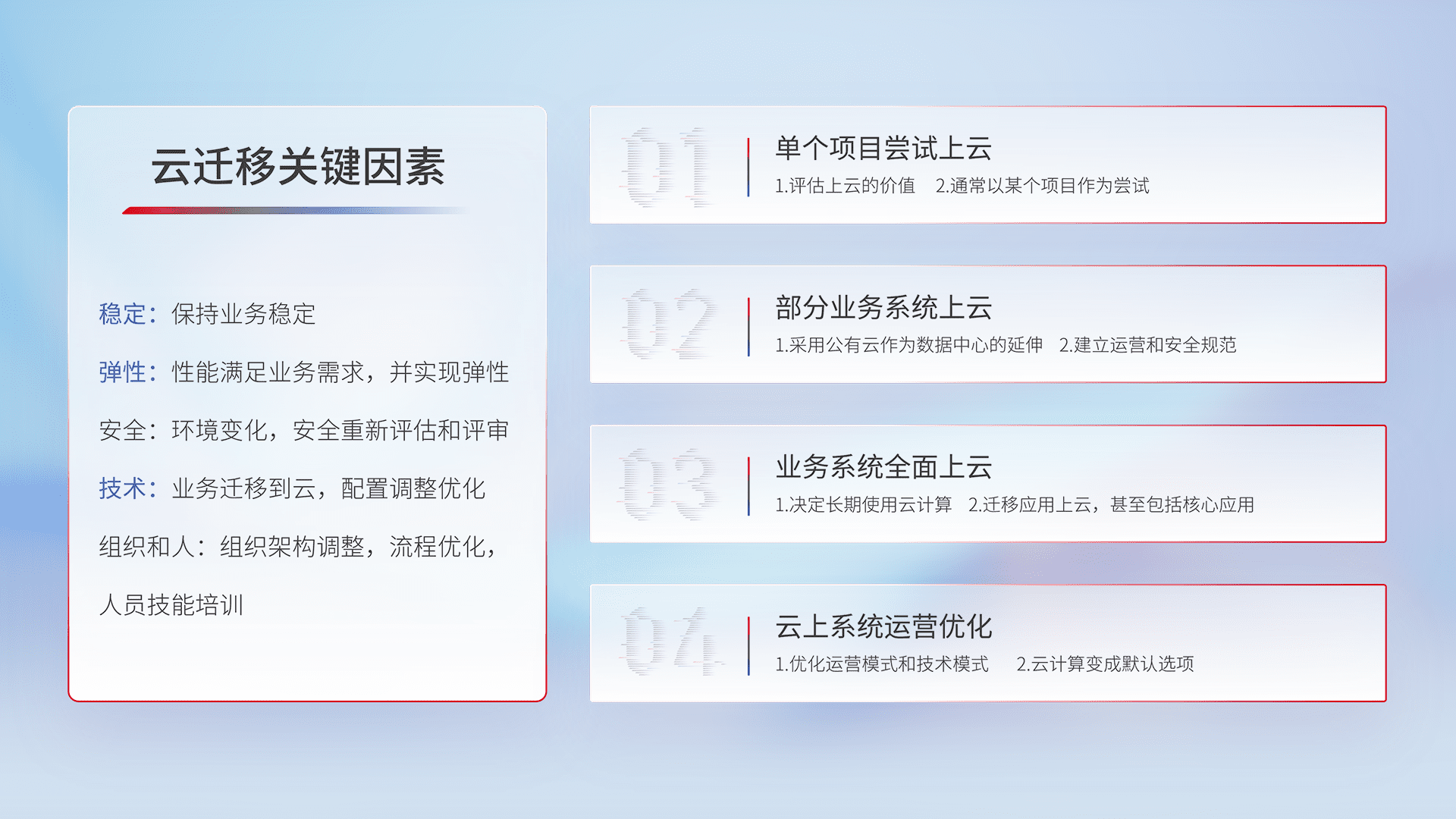结合实际业务,,从规划设计、、、、云平台选型、、云原生改造、、、、数据迁移、、、、集成交付,,迁移全过程为客户识别最佳上云路径,,,做好风险识别管理,,,,设计网络架构、、身份权限、、安全审计合规、、、、操作审计、、、、日志审计、、监控告警策略、、、多站点容灾设计等,,,对云上基础设施进行整体规划,,提升IT治理水平,,以满足弹性、、、、高可用、、、高性能的需求。。