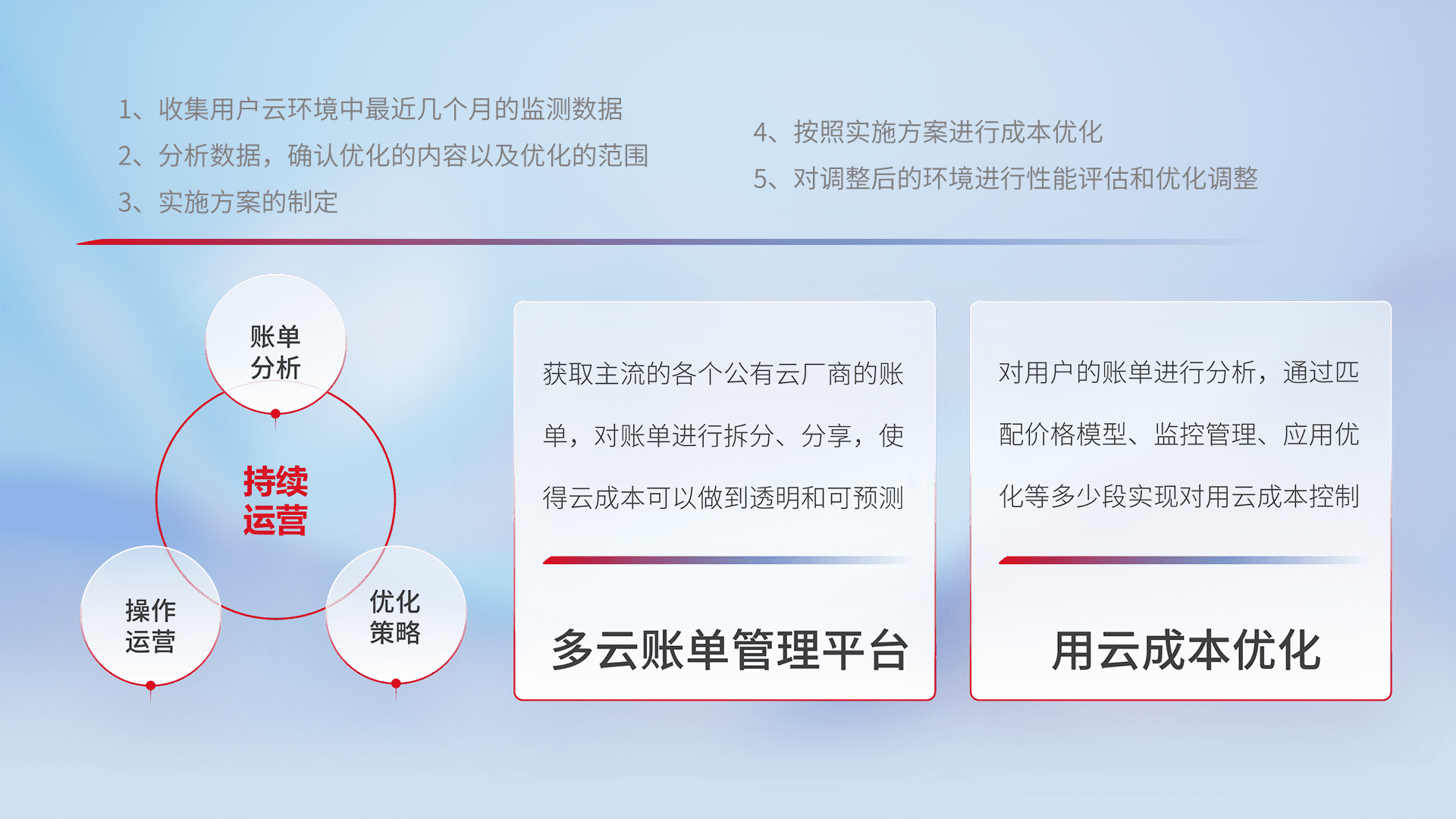 通过多云纳管,,以统一的资源数据模型把客户的云资源进行抽象和封装,,进而实现对多云资源的统一操作,,,保障云资源管理的可靠性、、、稳定性与可用性。。。。量身定制化运维内容,,配置、、开发运维、、、、补丁管理、、、、备份、、监控、、、、认证和访问管理、、、、审计和日常巡检等,,保障在用云过程中的可靠度,,稳定度以及高可用率。。